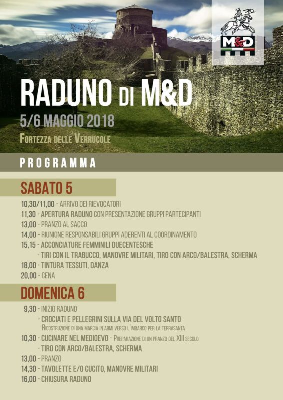 Sabato 5 e domenica 6 maggio 2018, presso la Fortezza di Verrucole Archeopark (S. Romano in Garfagnana, LU), si terrà il Raduno Nazionale degli aderenti al Coordinamento Mille&Duecento, che unisce i migliori gruppi in Italia dediti alla ricostruzione storica della vita del XIII° secolo.