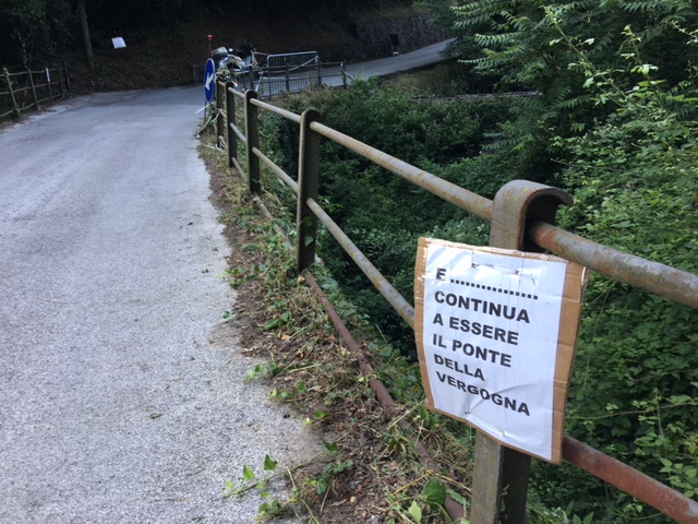 Strada della vergogna + ponte della vergogna. Questo ed altri due cartelli anonimi sono apparsi al Ponte dei Gasperetti, lungo la strada che conduce da una parte a Sommocolonia e dall’altra arriva fino a Montebono e dalla parte opposta della Corsonna prosegue per Valdivaiana e Renaio.