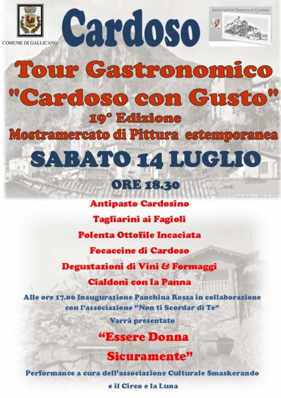 Sabato 14 luglio Cardoso vi aspetta per il tour gastronomico “Cardoso con gusto”. L’avvio alle 18,30 con tante cose buone da mangiare, ma ci saranno nella giornata anche tante iniziative di cornice, a cominciare dalla mostra mercato dio pittura estemporanea e, dalle 17, , l’inaugurazione della panchina rossa in collaborazione con l’associazione Non ti scordar di te. Di seguito verrà presentata “Essere donna sicuramente”, una performance a cura dell’associazione culturale Smaskerando e del Circolo La Luna.. Si esibiranno nell’occasione Lisa Lucchesi, Martina Tomei e Michela Innocenti.