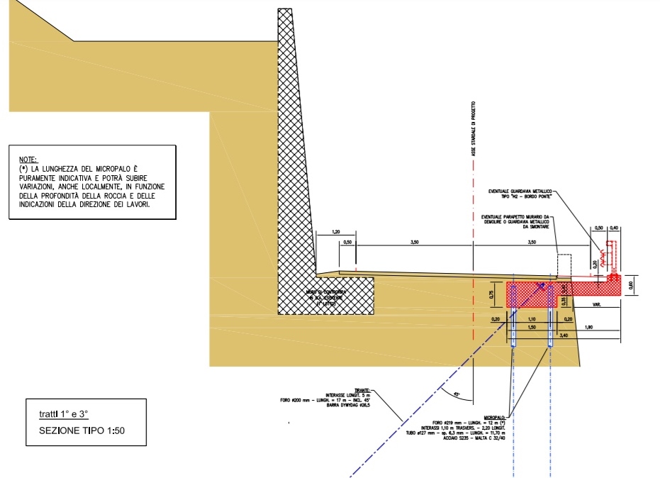 Due anni fa la Provincia realizzò il muro di cemento armato lungo 90 metri disposto a bordo carreggiata per sostenere e mettere in sicurezza il versante montuoso, oltre ad altre opere di sostegno e alla realizzazione di un diaframma costituito da pali di grande diametro costruito insieme ai pozzi drenanti verticali. La costruzione di questo muro di contenimento, da allora, ha però ridotto la larghezza della carreggiata di circa 2 metri. Questo secondo lotto servirà proprio per eliminare la strettoia e riportare la larghezza della strada ad 8,5 metri circa.