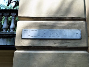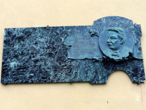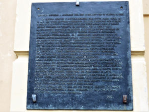 Vicino al Bollettino della Vittoria possiamo vedere una lastra di marmo grigio azzurro che ricorda la dedicazione dell’Asilo a Giovanni Pascoli, che subito vedremo.
