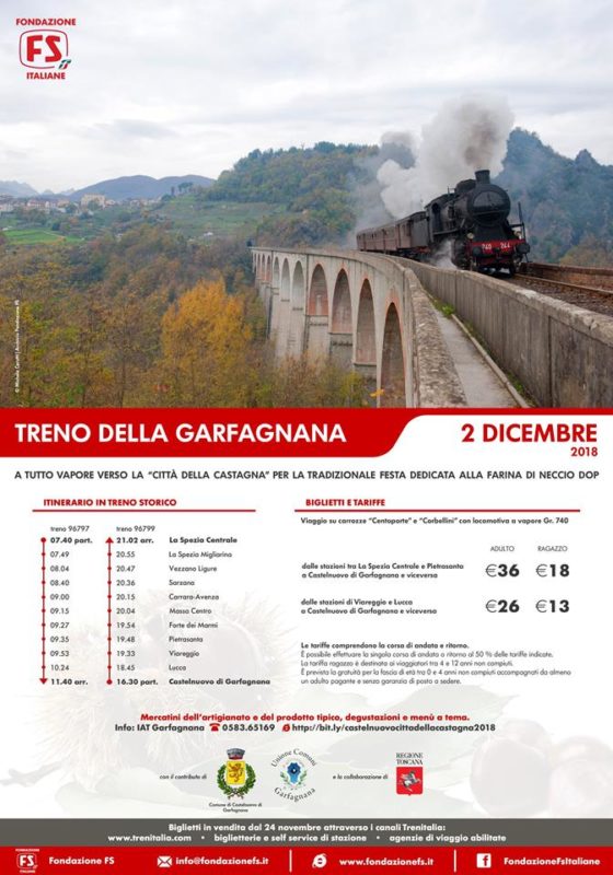 La manifestazione è organizzata dal Comune di Castelnuovo di Garfagnana in collaborazione con l’Unione Comuni Garfagnana e nella giornata di domenica vede anche l’arrivo di un treno a vapore con partenza da La Spezia accolto dalla banda musicale “G. Verdi”. Biglietti disponibili su www.trenitalia.com a partire da Sabato 24 Novembre.