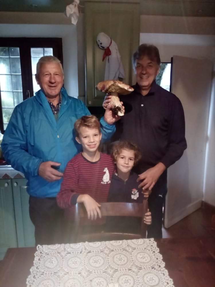 I cambiamenti climatici in atto, di fatto hanno mutato anche le stagioni. Lo sta a dimostrare questa foto con un bel esemplare di porcino di ben 1,200 kg trovato i primi di novembre da Paolo Marroni alias Cavallo, nei boschi della nostra zona (nelle foto coi nipotini e l’altro nonno Pietro).