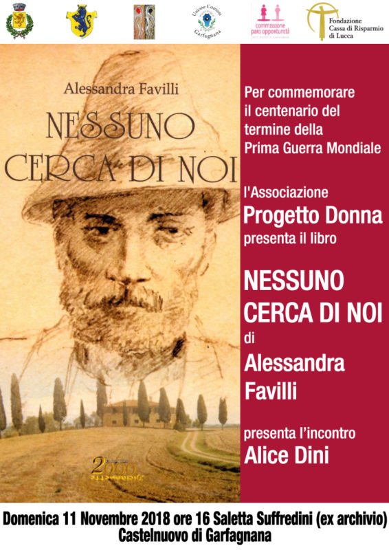 CASTELNUOVO DI GARFAGNANA – Per commemorare il centenario del termine della Prima Guerra Mondiale, domenica 11 novembre (ore 16.00, Saletta Suffredini Ex-archivio) l’Associazione Culturale Progetto Donna di Castelnuovo di Garfagnana presenta il libro – Nessuno cerca di noi – alla presenza dell’autrice Alessandra Favilli.