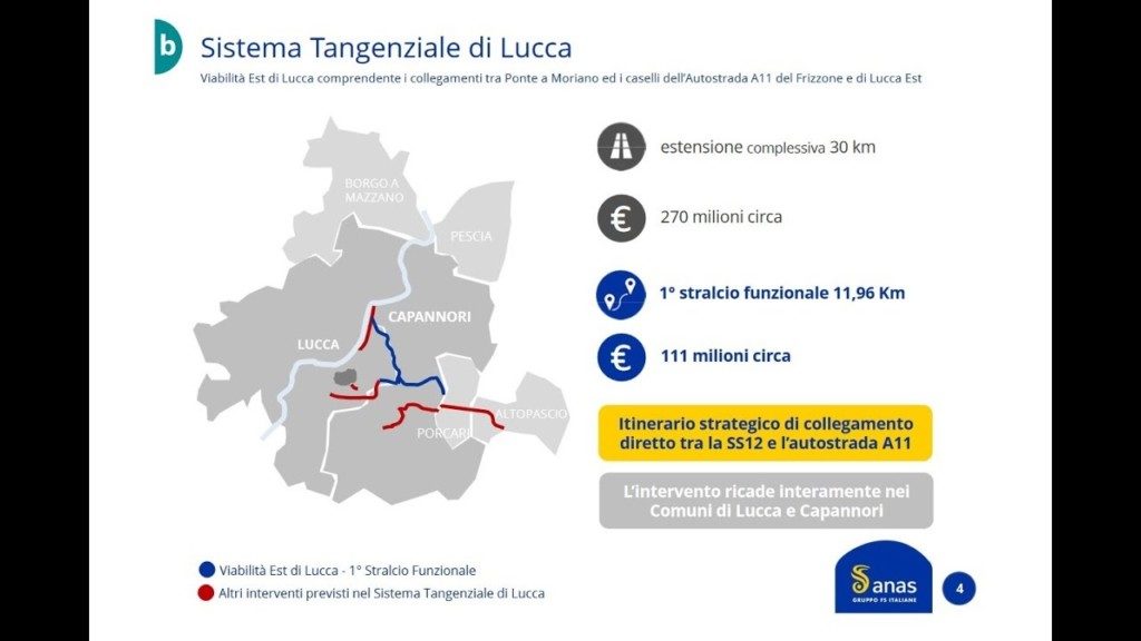 Il progetto definitivo degli Assi Viari è pronto. Un opera lunga 30 km con un osto di 270milioni di euro anche se al momento, si parla di Asse Nord-Sud, 12 km che serviranno ad unire la Statale 12 del Brennero alla Autostrada A11. Un progetto talmente sconvolgente a livello ambiantale che Anas prevede di piantare oltre 27mila alberi lungo l’intera estensione del tracciato per mitigarne l’impatto. L’intervento ricadra’ esclusivamente sui comuni di Lucca e Capannori con le due amministrazioni ad oggi su posizioni diametralmente opposte. Da una parte il sindaco di Lucca Tambellini che spinge per partire il prima possibile, dall’altra quello di Capannori Menesini (che ricopre anche il ruolo di presidente della Provincia) che oggi ha polemicamente disertato l’incontro: per lui così come concepito il sistema tangenziale non va bene perche’ non tiene conto delle istanze dei cittadini della Piana. Sul progetto definitivo saranno avviate le procedure di Legge Obiettivo: verifica di ottemperanza alla Valutazione di Impatto Ambientale già svolta sul progetto preliminare; acquisizione dei pareri di tutti gli Enti nell’ambito della Conferenza dei Servizi da avviare presso il Ministero delle Infrastrutture e Trasporti e approvazione del CIPE.. La fine dei lavori e’ prevista per il 2023 ma il percorso di realizzazione appare assai lungo e quasi certamente costellato di problemi e proteste.