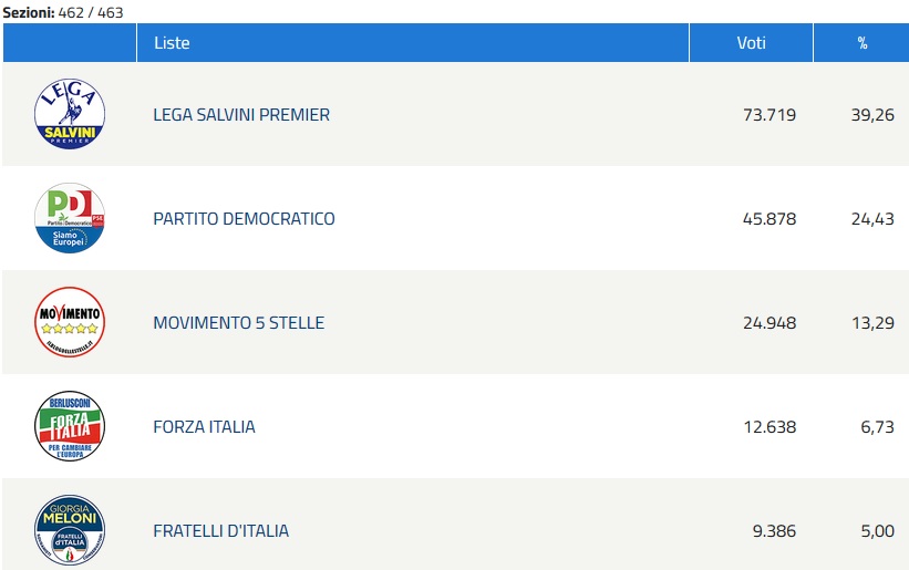 PROVINCIA DI LUCCA – Sul territorio provinciale la Lega è il primo partito alle Europee con il 39% seguita dal Pd al 24%; con una sola sezione ancora da scrutinare il Movimento 5 Stelle si ferma al 13%; sotto il 7% Forza Italia (6,73%) che è quasi raggiunta dal 5% di Fratelli d’Italia.