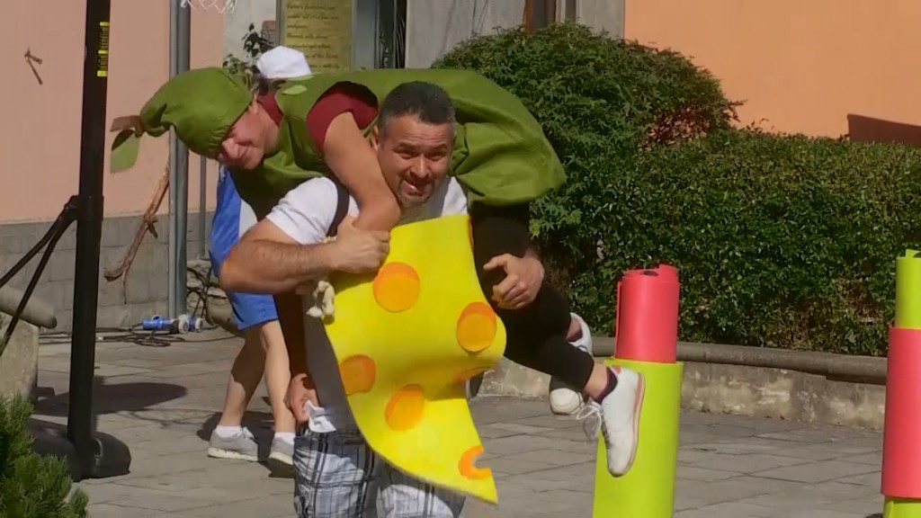 Il percorso che è stato scelto quest’anno ha visto la partenza come sempre davanti al municipio e poi una serie di ostacoli sportivi. Dopo la partenza i concorrenti dovevano fare tre palleggi e poi fare canestro, a seguire mandare tre palle da tennis oltre la rete , ancora avanti calciare un rigore recuperare poi la sciarpa e la bandiera italiana come simbolo sportivo e portare il tutto oltre la porta storica d’ingresso al centro storico.