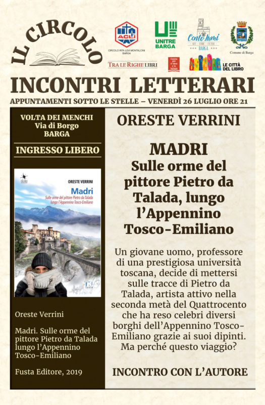BARGA – Venerdì 26 luglio alle ore 21, nell’ambito degli “Appuntamenti sotto le stelle” organizzati da Unitre, Cento Lumi, Tra le righe ed altre associazioni, si terrà un nuovo incontro con un autore con la presentazione del libro “Madri. Sulle orme di Pietro da Talada, lungo l’Appennino Tosco-Emiliano” di Oreste Verrini.