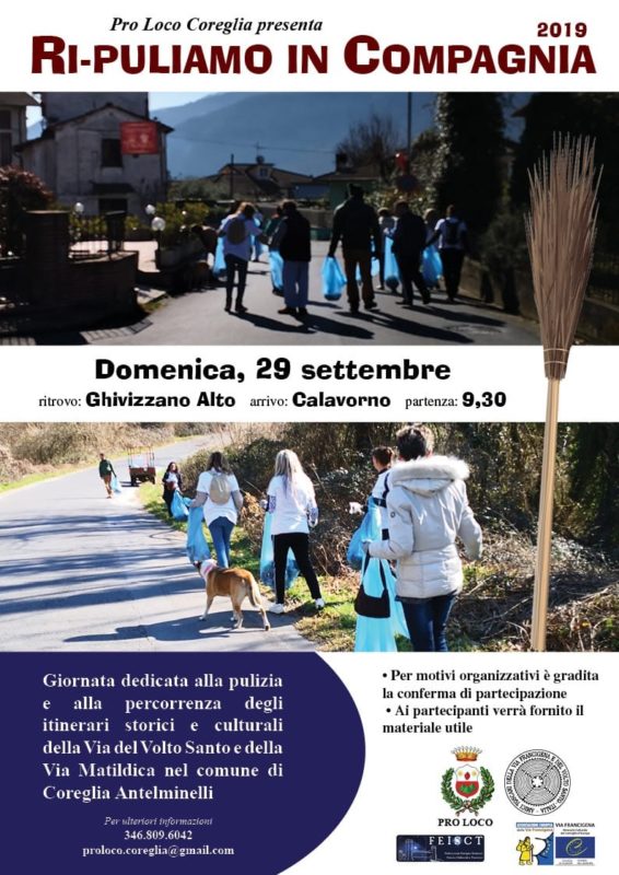 Torna infatti “Ri-puliamo in compagnia”. L’appuntamento è per domenica 29 settembre con ritrovo a Ghivizzano Alto (partenza alle 9,30) e arrivo a Calavorno. Sarà una giornata dedicata alla pulizia e alla percorrenza degli itinerari storici e culturali della via del Volto Santo e della via Matildica. Per motivi organizzativi è gradita la conferma di partecipazione. Ai partecipanti verrà fornito il materiale utile. Per ulteriori informazioni: 340.2946579; proloco.coreglia@gmail.com.