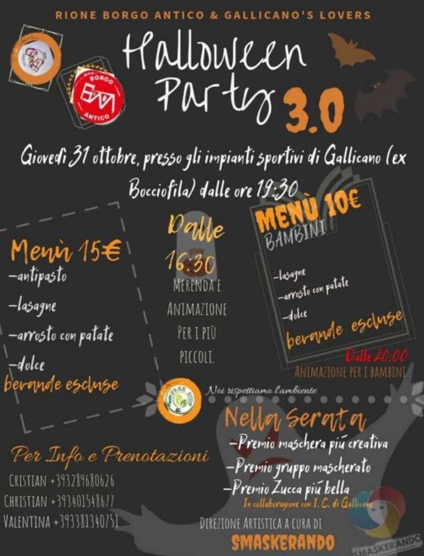 Il rione Borgo Antico di Gallicano organizza la terza edizione dellla festa di Halloween presso gli impianti sportivi. La festa si terrà naturalmente il 31 ottobre e viene organizzata in collaborazione con Gallicano’s Lovers. Dalle 16.30 ci sarà una merenda per tutti i bimbi e poi la festa proseguirà con la cena e con il dopo cena. Verranno assegnati anche premi per maschera più creativa e gruppo mascherato.