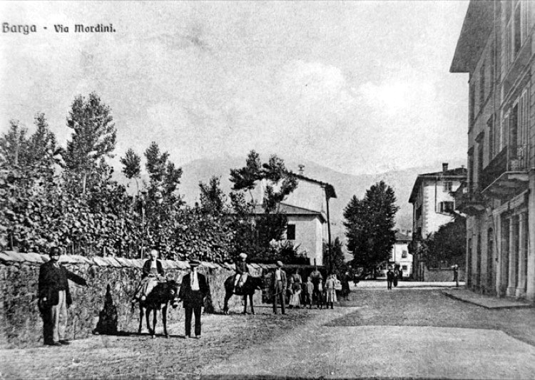 A questo largo, detto il Giardino, non ancora definito dal punto di vista urbano, in questo 1916, scelta come data di riferimento storico, oltre alle vie sterrate o inghiaiate già accennate nel precedente articolo, arrivano altre e diverse strade di simile natura: la provinciale che salendo da Fornaci di Barga, passando dal Fosso e Porta Reale, qui giunge oltrepassando il Ponte Nuovo, costruito da circa vent’anni. Questo tratto di strada che segue sino a Castelvecchio Pascoli, in omaggio al Poeta è intitolato al suo nome sin da quando ci fu il suo secondo corteo funebre che mosse dal cimitero di Barga il 6 ottobre 1912. Inoltre, lì al Giardino vi arriva un’altra via dal Ponte di Borgo oggi Ponte Vecchio. È la precedente parte finale della strada proveniente da Fornaci di Barga, prima che fosse fatto il ricordato Ponte Nuovo e che anch’essa è una via che dà accesso al sobborgo del Giardino, il cui tratto finale di Barga è intitolato ad Antonio Mordini. Altra via arriva al largo del Giardino scendendo Canteo, la via che porta alla montagna. Una strada, quasi un sentiero interpoderale, che è destinato a divenire il più bel viale di Barga, per i caratteristici e ricchi villini che poi vi costruiranno gli emigranti di ritorno dopo il futuro e drammatico terremoto del 1920. Il Comune di Barga, nell’allora più che imprevedibile dopo guerra 1940-45, lo intitolerà al sindaco di Barga di questo 1916, volontariamente distaccatosi dal suo incarico a causa della presente Grande Guerra che fiammeggia sui monti a nord-est d’Italia: il medico legale, scienziato italiano della semiotica medico-legale, Prof. Cesare Biondi.