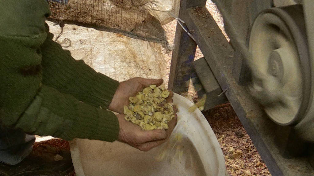 Infatti una volta completata la raccolta e mescolate si posizionano 4 castagne su 4 stecchi giusto per riconoscerle e trascorso il tempo necessario si controllano le 4 spie per capire se le castagne sono pronte per la battitura. Per cui si è proceduto alla battitura utilizzando una macchina Biagioni di Mologno ma in questo caso azionata da un motore elettrico per evitare l’assordante rumore del motore a scoppio. Questo forse è il primo metato ad essere battuto in Garfagnana.