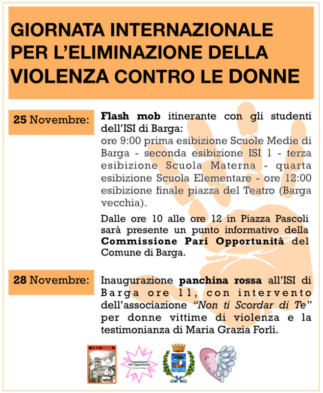 All’insediamento ufficiale svotosi nei giorni scorsi, presieduto dalla Sindaca Caterina Campani, sono state votate all’unanimità Sonia Maria Ercolini come Presidente e Vittoria Cardella come Vice-Presidente. La Commissione si è subito messa a lavoro per coordinare alcuni eventi con delle realtà del territorio che verranno presentati sabato prossimo. La prima iniziativa importante, grazie alla collaborazione con ISI Barga, sarà lunedì 25 novembre in occasione della Giornata mondiale contro la violenza sulle donne: un Flash Mob itinerante per le scuole di Barga partendo dalle Scuole Medie alle 9.00, a seguire alle 9,30 ISI, ore 10,15; Scuola Materna, ore 11, Scuole Elementari e per finire alle 12 l’ultima esibizione davanti al Teatro. Durante la mattinata alcune componenti della Commissione saranno presenti in Piazza Pascoli con un punto informativo e la consegna dei fiocchi bianchi. L’iniziativa per dire no alla violenza proseguirà giovedì 28 alle 12,15 con l’inaugurazione all’ISI Barga della 85.ma panchina rossa, gentilmente donata da Alessandra Magnani. In precedenza, alle 11 nell’Aula Magna, i saluti delle autorità e gli interventi da parte di Maria Stella Adami Presidente dell’associazione “Non ti scordar di te” e di Maria Grazia Forli mamma di Vanessa Simonini, barbaramente uccisa a Gallicano e che la Valle del Serchio nion ha mai dimenticato.