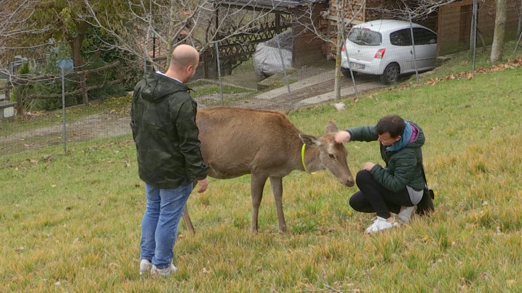 Quando qualcuno le si avvicina il piccolo cerbiatto si allontana di alcuni metri mentre la Cerva rimane tranquillamente a farsi accarezzare. insomma, ormai è diventata una vera star. Avvicinandosi si ha la sensazione che l’animale cerchi quasi un contatto umano. Inoltre gradisce gradisce molto le verdure e anche le mela e con i più piccoli si mette in posa e dispensa loro leccate amichevoli. Nel paese di Chiozza come in tutti i borghi di montagna è molto praticata l’attività venatoria. Ma cosa dicono i cacciatori di questo esemplare diventato così domestico ? La “signora” Carmela, questo il nome dato alla cerva, sembra gradire molto questa sua condizione anche perchè si sente coccolata e protetta da tutta la comunità. Siamo sicuri che in breve tempo anche la cerva più giovane seguirà l’istinto della mamma nel concedersi alla comunità di Chiozza. Nel frattempo i paesani stanno cercando anche possibili soluzioni per nutrire le due bestiole anche nel periodo invernale che da queste parti è rigido. Infatti quando la neve scende copiosa aumentano le difficoltà di sopravvivenza per gli esemplari erbivori come la nostra Carmela.