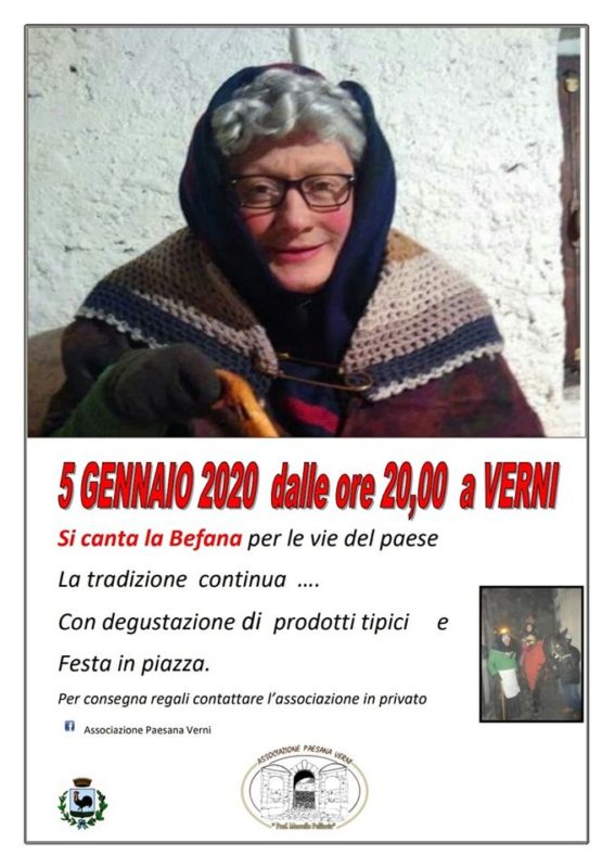 La tradizione della Befana è particolarmente radicata e coinvolgente nel paese di Verni, un appuntamento a cui è difficile mancare per chi, almeno una volta, ha vissuto questa esperienza; i volti incantati dei bambini, l’allegria dei numerosi giovani e meno giovani dispensano una serenità difficile da raccontare.