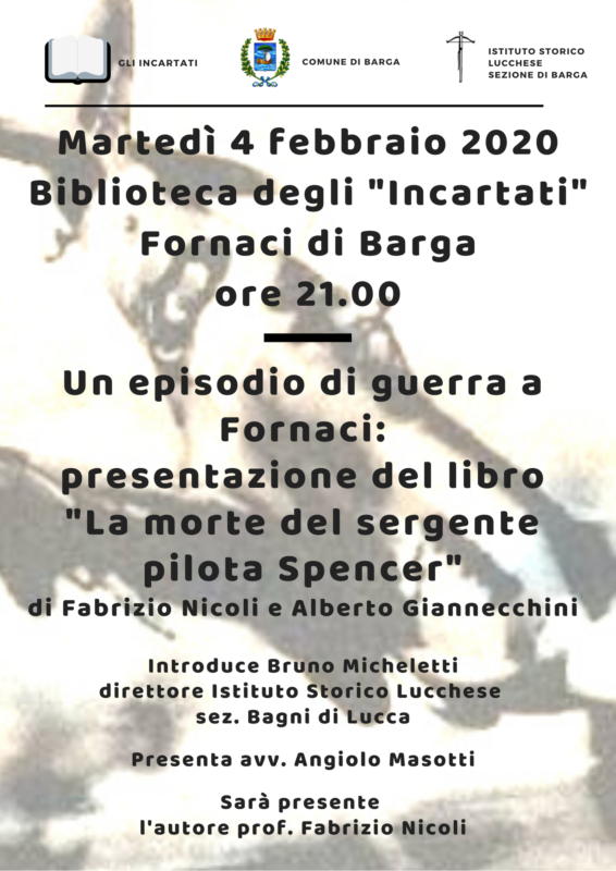 Martedì 4 febbraio alle ore 21, presso la Biblioteca degli Incartati a Fornaci, si terrà la presentazione del libro “La morte del Sergente Pilota Spencer” di Fabrizio Nicoli e Alberto Giannecchini, evento culturale organizzato dal Gruppo Gli Incartati e dalla sezione di Barga dell’Istituto Storico Lucchese Sarà l’occasione per parlare di un evento della guerra che ebbe scena a Fornaci di Barga e di cui si è molto dibattuto negli ultimi anni e del quale peraltro ha scritto anche il fornacino Mario Camaiani