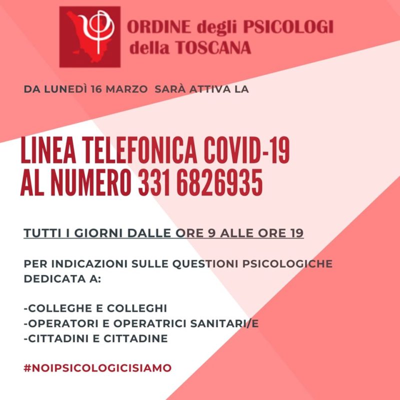 Bene sapere comunque, che l’ordine degli Psicologi della Toscana è attivato una linea telefonica Covid-19 per indicazioni sulle questioni psicologiche dedicata a colleghi e colleghe, operatori ed operatrici sanitari/e e cittadini e cittadine.
