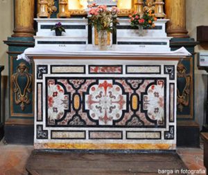 Sempre la stessa Autrice, nel libro “La Pieve di Santa Maria Assunta di Loppia”, del 2008, nell’articolo “La Pieve di Loppia nel suo archivio parrocchiale”, così ci dice ancora dell’altare maggiore della chiesa: “La mensa formata di stucco lustrato a mano e dipinto con fiori di vari colori”.