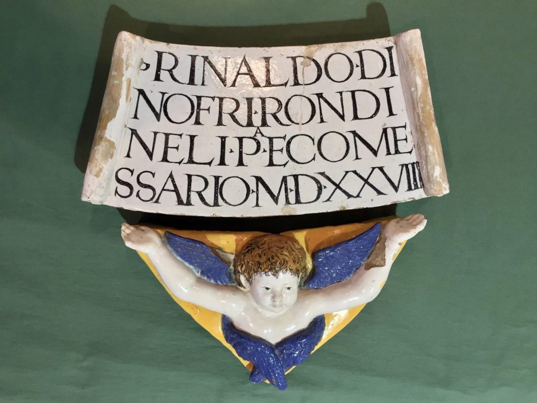 Le parti recuperate sono quelle che componevano lo stemma nella sua parte inferiore ovvero il cartiglio, sostenuto da un cherubino dalle ali blu cobalto, sul quale si legge «RINALDO DI / NOFRI RONDI / NELI P<ODEST>A E COME / SSARIO MDXXVIII». Sappiamo che il costo di uno stemma del genere poteva oscillare tra le 6 e le 7 lire, una cifra cioè piuttosto ragionevole e che permetteva al committente di fregiarsi di un manufatto che aveva tutti i connotati di un gioiello da parete.