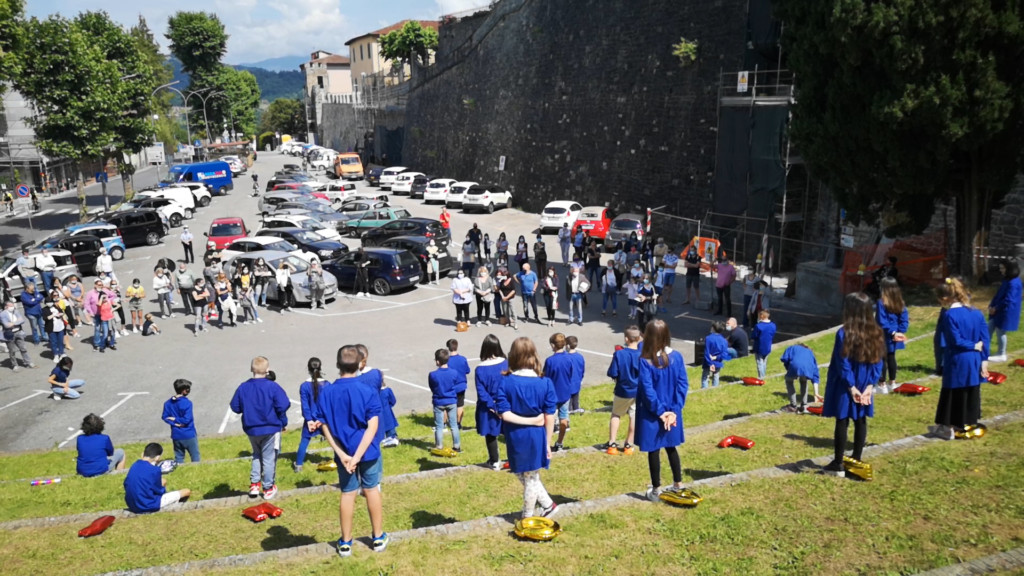BARGA – Saluto in presenza, lunedì mattina a Barga, sul Piazzale del Fosso, per 36 bambini delle classi quinte della scuola primaria di Barga che si sono ritrovati insieme per festeggiare la chiusura della loro esperienza nella scuola elementare