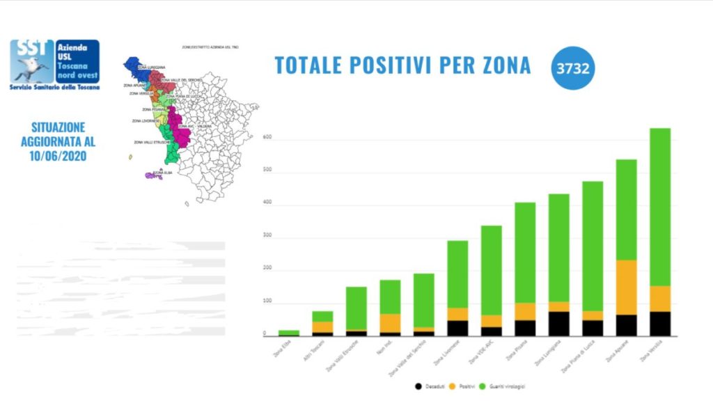Le zone più colpite, in coerenza e conseguenza ai territori più colpiti dal virus, sono state la Lunigiana (con 92 decessi, 74 per residenza), la Versilia (con 74 decessi, 75 per residenza) e le Apuane (70 decessi, 65 per residenza).