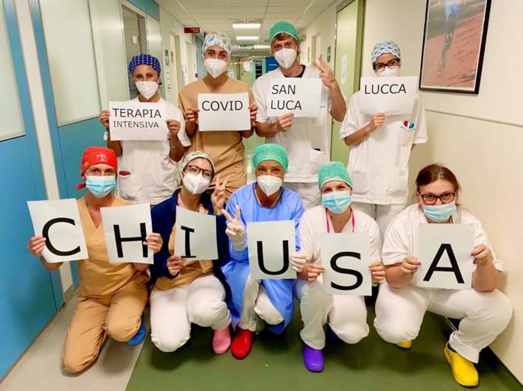 LUCCA – Dopo alcuni mesi di dura battaglia adesso possono dirlo e testimoniarlo con questa bella foto. Personale medico e paramedico dell San Luca scrivono la parola fine. E’ stato infatti chiuso nella giornata di martedì 30 giugno il reparto di terapia intensiva riserrato ai malati covid-19.