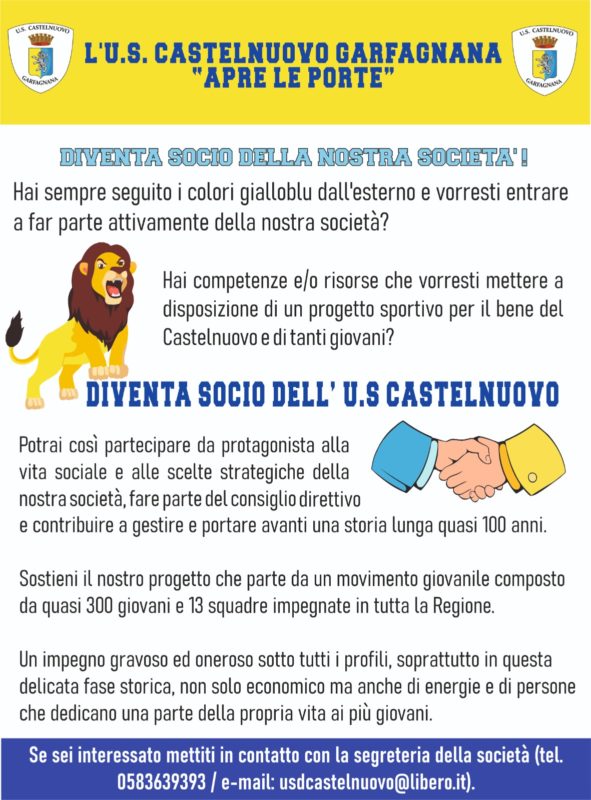 CASTELNUOVO DI GARFAGNANA – Hai sempre seguito i colori gialloblu dall’esterno e vorresti entrare a far parte attivamente della società della gloriosa Unione Sportive? Hai competenze e/o risorse che vorresti mettere a disposizione di un progetto sportivo per il bene del Castelnuovo e di tanti giovani? Diventa socio dell’U.S. Castelnuovo!