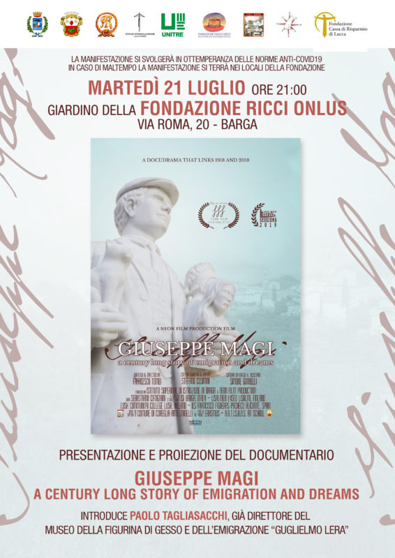 Martedì 21 luglio 2020 alle ore 21, presso il giardino della Fondazione Ricci Onlus, dove si terrà la proiezione e la presentazione del documentario: “GIUSEPPE MAGI, A CENTURY LONG STORY OF EMIGRATION AND DREAMS”. Introduce Paolo Tagliasacchi, direttore del museo della figurina di gesso e dell’emigrazione “Guglielmo Lera”. Saranno presenti gli autori.