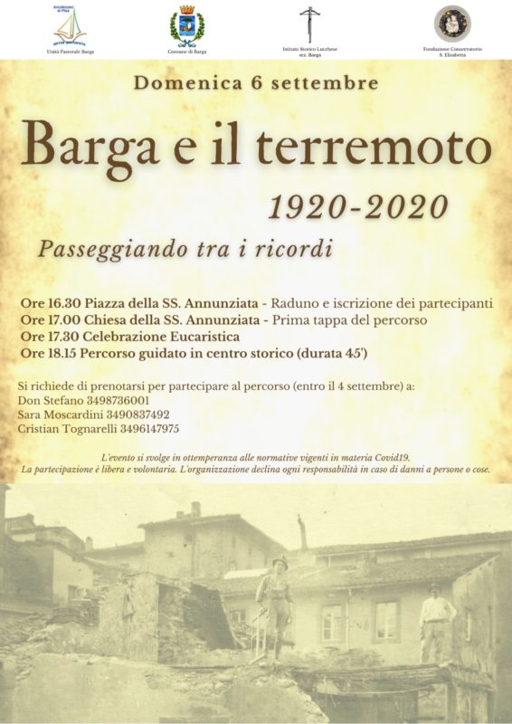 Domenica prossima ci sarà un percorso guidato nel centro storico che ricorderà la storia di Barga e dei terremoti, ma per partecipare, stanti le normative Covid, sarà necessario prenotarsi. E’ possibile farlo contattando don Stefano Serafini (3498736001), Cristian Tognarelli (3496147975) o Sara Moscardini (3490837492).