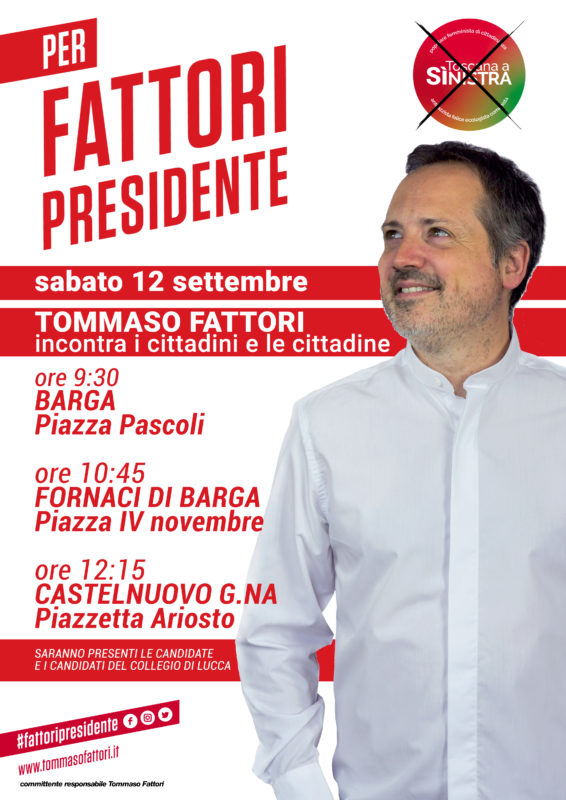 BARGA – Sabato 12 settembre Tommaso Fattori, candidato presidente alla Regione Toscana per la lista Toscana a Sinistra incontrerà le cittadine e i cittadini della Mediavalle e Garfagnana.
