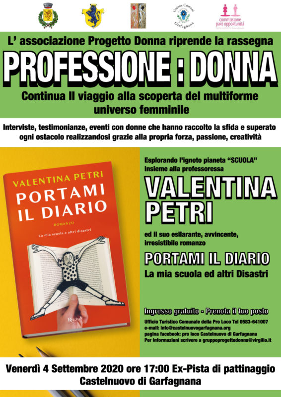CASTELNUOVO DI GARFAGNANA – Venerdì 4 settembre alle17.00 – Ex pista di pattinaggio, tornano gli appuntamenti con “Professione Donna”, iniziativa organizzata dall’Associazione culturale Progetto Donna, con un incontro dedicato al primo romanzo di Valentina Petri sul mondo della Scuola. L’autrice vive a Vercelli, dove insegna lettere all’istituto professionale IPSIA Lombardi. Condivide le sue storie di scuola sulla pagina Facebook Portami il diario.