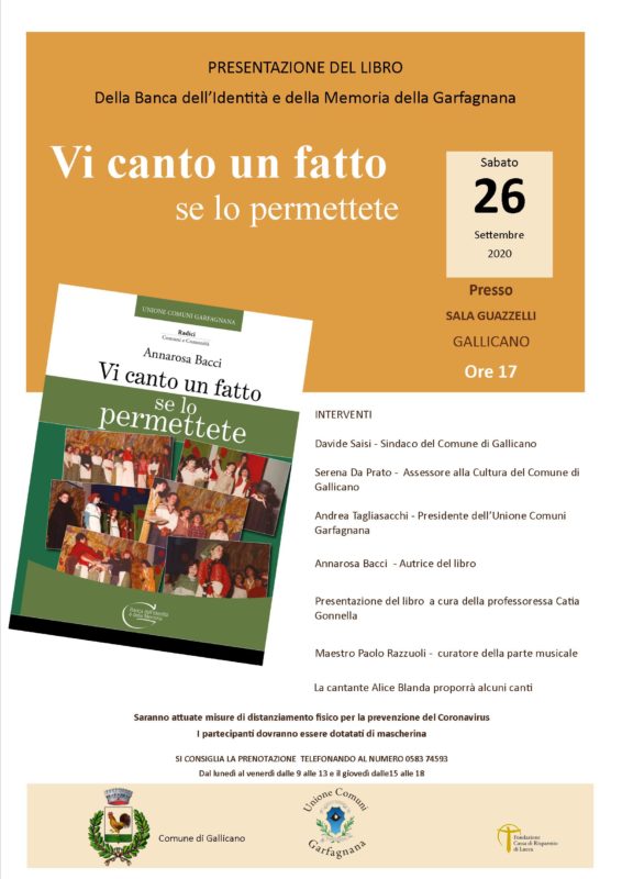 In questo spirito l’Unione si apre ad un nuovo contributo editoriale “VI CANTO UN FATTO SE LO PERMETTETE” – realizzato nell’ambito della Collana della Banca dell’Identità e della Memoria della Garfagnana sezione Radici, Comuni e Comunità con il sostegno della Fondazione Cassa di Risparmio di Lucca – che verrà presentato sabato 26 settembre ore 17,00 presso la Sala Guazzelli di Gallicano alla presenza dell’autrice Annarosa Bacci.