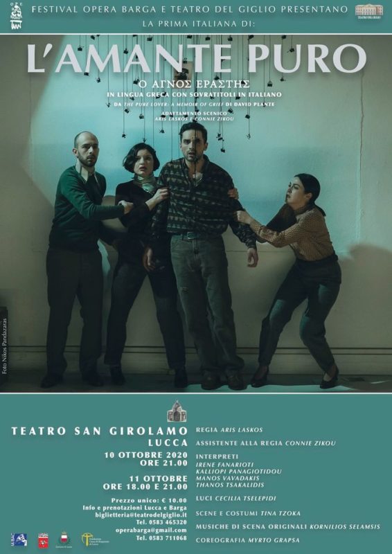 Realizzato in collaborazione da Teatro del Giglio e Opera Barga, L’amante puro è andato in scena in prima mondiale ad Atene nel novembre 2019. A Lucca, sabato 10 e domenica 11 ottobre, sarà proposto in lingua originale con sovratitoli in italiano (traduzione inglese di Elias Maglinis, traduzione italiana dall’inglese di Nicholas Hunt). Adattato per la scena dallo stesso regista Aris Laskos e da Connie Zikou, lo spettacolo è interpretato da Irene Fanarioti, Kalliopi Panagiotidou, Manos Vavadakis e Thanos Tsakalidis; il cast è lo stesso delle rappresentazioni al Teatro del Nuovo Mondo di Atene, con l’eccezione di Katerina Patsiani che, per disposizione anti Covid 19 del Teatro Nazionale Greco di Atene, non ha potuto ottenere il permesso di espatrio e unirsi agli altri attori, e che è stata sostituita per l’occasione da Kalliopi Panagiotidou. L’impianto visivo è affidato a Tina Tzoka (scene e costumi), Cecilia Tselepidi (luci), Myrto Grapsa (coreografia); Kornilios Selamsis firma la musica di scena originale.