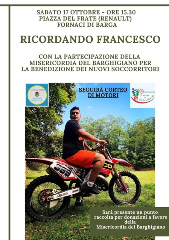 Parteciperà tutto il sodalizio della Misericordia del Barghigiano – servizio ambulanza, di cui Francesco era un entusiasta volontario e nell’occasione ci sarà la benedizione dei nuovi soccorritori formati in questi mesi. Sarà anche presente un punto di raccolta per le donazioni a favore della misericordia del barghigiano.