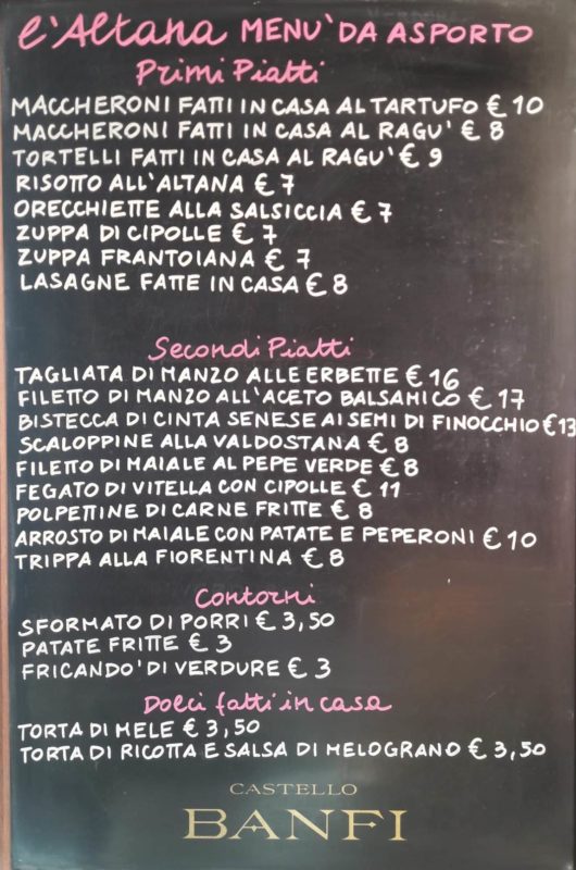 Quello in foto è il menù attuale che comunque varierà di settimana in settimana. Per l’asporto è stato fatto uno sconto sui prezzi.