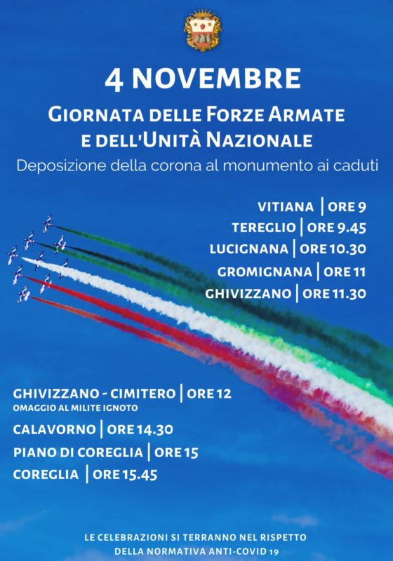 Alle 9 di mercoledì 4 l’appuntamento è a Vitiana, di fronte al monumento ai caduti. A seguire, alle 9.45, le autorità e i rappresentanti delle associazioni si sposteranno a Tereglio, per poi raggiungere Lucignana alle 10.30. Alle 11 il ritrovo è a Gromignana, mentre alle 11.30 a Ghivizzano. A Ghivizzano si terrà anche l’omaggio al Milite Ignoto al cimitero della frazione, in programma per le 12. Seguiranno Calavorno, ore 14.30, Piano di Coreglia, ore 15 e, infine, Coreglia capoluogo, dove alle 15.45 l’appuntamento è al monumento ai caduti.