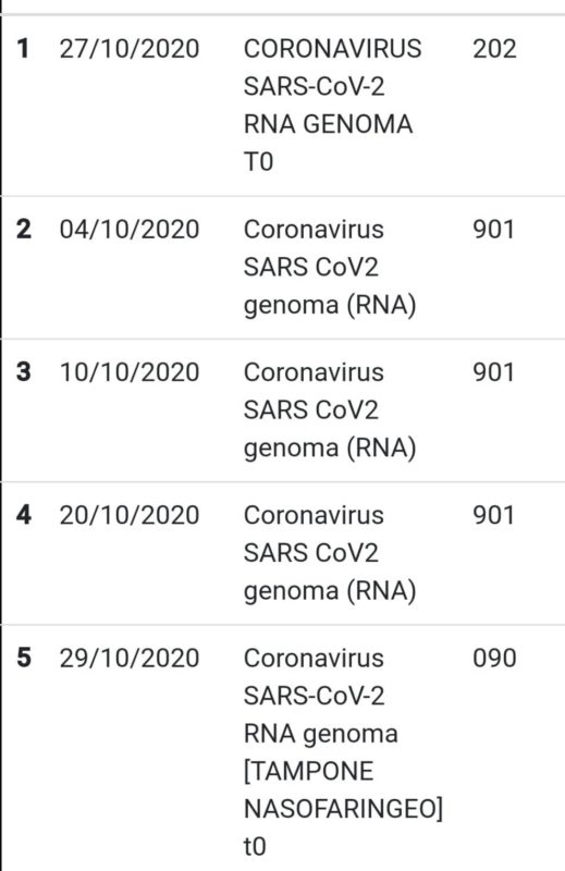 Un po’ kafkiano, a dire il vero, è anche l’elenco che mi si presenta nella suddetta pagina che di certo non riporta mai l’esito del tampone più recente ma ogni tanto offre delle interessanti novità. Come il referto di un tampone in data 27 apparso misteriosamente ieri, che si aggiunge a quello già presente in data 29. Sono uguali, identici, e dicono la stessa cosa, ovvero l’incresciosa scritta DA RIPETERE di cui avevo già parlato. Vi ricordo però, che io, il tampone l’ho fatto il 28, e non il 27… e neppure il 29…