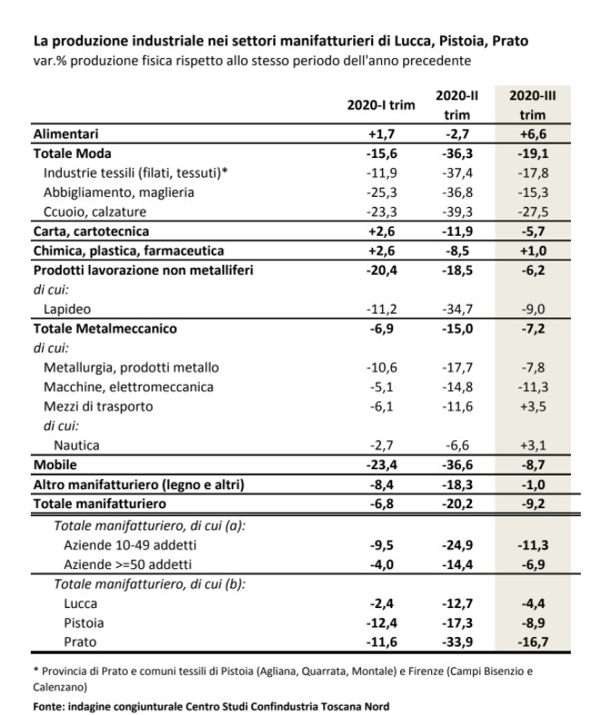 L’indagine congiunturale del Centro studi di Confindustria Toscana Nord evidenzia per il 3° trimestre 2020, rispetto allo stesso periodo del 2019, una perdita sensibile per Lucca (-4,4%), più consistente per Pistoia (-8,9%), forte per Prato (-16,7%). Il – 9,2% che rappresenta il risultato complessivo per i tre territori scaturisce quindi da situazioni diverse legate a loro volta alla netta differenziazione fra tipologie merceologiche. Se l’alimentare segna +6,6% e la chimica-plastica-farmaceutica +1%, tutti gli altri macrosettori si collocano in territorio negativo, ma con accentuazioni differenti: dal -5,7% della carta e cartotecnica si passa al -7,2% della metalmeccanica e al -8,7% del mobile, fino al settore del manifatturiero italiano più penalizzato dal covid, la moda, che segna -19,1% .