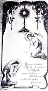 Mentre sul fronte tra due angeli oranti si può leggere in francese: Adorons à jamais le Saint Sacrement de l’Autel source de toute bènèdiction et de toute grace pour nous. (Adoriamo per sempre il Santo Sacramento dell’altare, fonte di ogni benedizione e grazia per noi.)