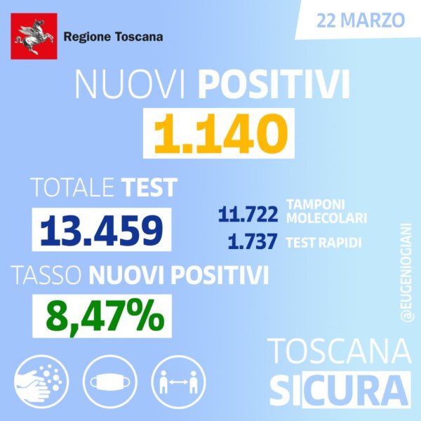 TOSCANA – I nuovi casi registrati in Toscana sono 1.140 su 13.459 test di cui 11.722 tamponi molecolari e 1.737 test rapidi. Il tasso dei nuovi positivi è 8,47% (17,3% sulle prime diagnosi). Ieri erano 1358 con un tasso del 6,49%.