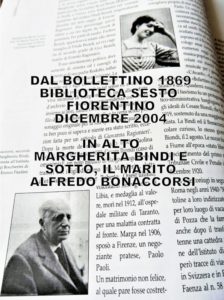 Margherita, nata il 6 luglio 1884, si sposerà nel 1906 a Firenze con il commerciante Paolo Paoli di Prato ma si dice che fu tutt’altro che un’unione felice. Roberto Bindi, come vedremo, certamente conosciuto da Bonaccorsi, nel 1911 partirà con i Granatieri di Sardegna quale volontario nella guerra di Libia e su quel fronte contrasse una malattia che lo condurrà alla morte all’ospedale di Taranto nel 1912. Pare allora che Roberto, forse prima della partenza, avesse consegnato ad Alfredo Bonaccorsi una lettera da recapitare alla sorella Margherita, in cui si raccomandava che lasciasse il marito perché con lei non si stava comportando bene. Margherita attuerà il consiglio del fratello, perché dopo non molti anni divorzierà dal marito per unirsi in matrimonio con il latore della lettera, Alfredo Bonaccorsi.
