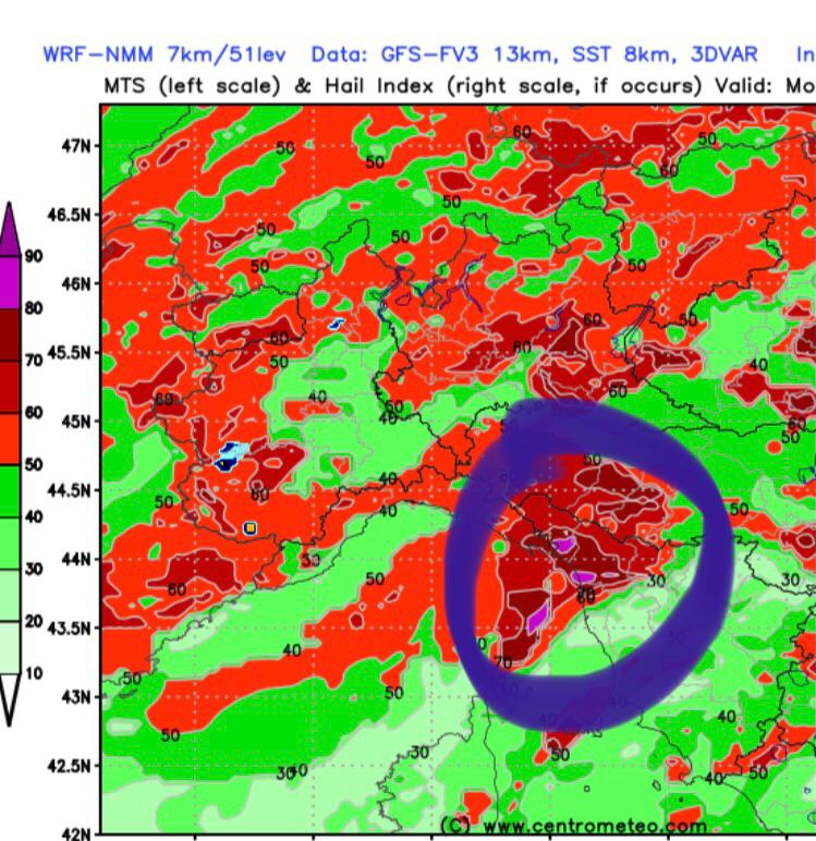 Iniziano a farsi più chiare le dinamiche del peggioramento che abbiamo annunciato da qualche giorno è legato all’influenza di una goccia fredda che anche ieri a provocato violenti temporali su alcune zone dell’Europa. Diciamo subito che gli effetti saranno marginali, l’aria fredda non riuscirà ad entrare direttamente nel Mediterraneo e quindi non dovremo aspettarci un peggioramento particolarmente significativo. Certo, guardando i modelli questa mattina vediamo che gli indici temporaleschi previsti per la mattinata di lunedì sono comunque importanti. Nella foto a corredo dell’articolo vediamo come l’indice MTS, ovvero la probabilità che possono svilupparsi forti temporali, sia a fondo scala, colorato in violetto, proprio sulle nostre zone. Come sempre, quando si tratta di temporali, dovremmo seguire live lo sviluppo della situazione ,ma dovremmo comunque attendere o lunedì mattina all’insegna dei colpi di tuono e delle precipitazioni. Al momento, tuttavia, niente di assolutamente preoccupante.