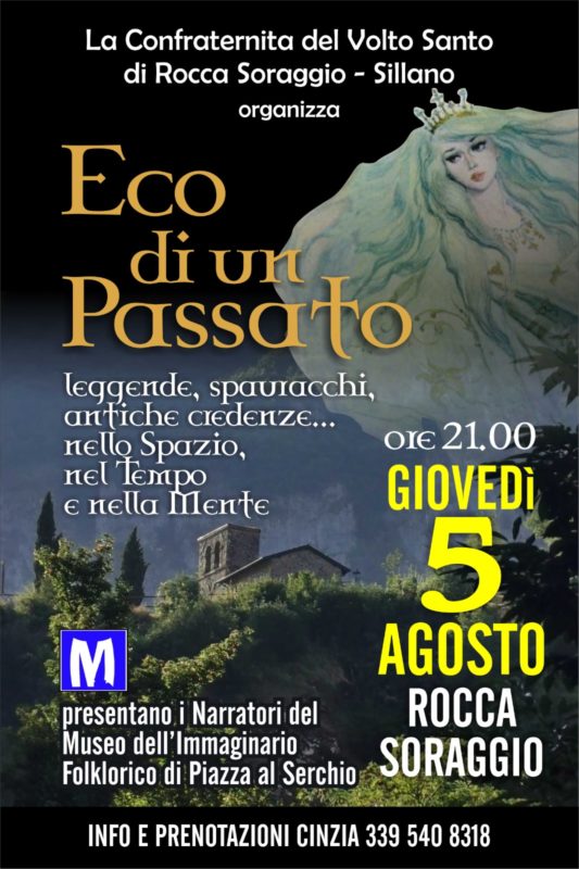 ROCCA SORAGGIO – Giovedì 5 agosto alle ore 21.00 presso Rocca Soraggio il Museo Italiano dell’Immaginario Folklorico presenta Eco di un Passato – Leggende, spauracchi, antiche credenze…nello Spazio, nel Tempo e nella Mente, evento organizzato da La Confraternita del Volto Santo di Rocca Soraggio – Sillano.