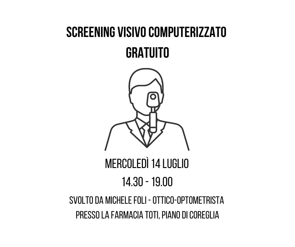 PIANO DI COREGLIA – Uno screening visivo computerizzato gratuito con uno strumento all’avanguardia ed in grado di fornire una svariata serie di informazioni, E’ quello che l’ottico- optometrista Michele Foli di Fornaci terrà mercoledì 14 luglio dalle 14,30 alle 19, presso la Farmacia Toti di Piano di Coreglia.