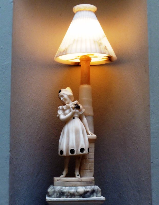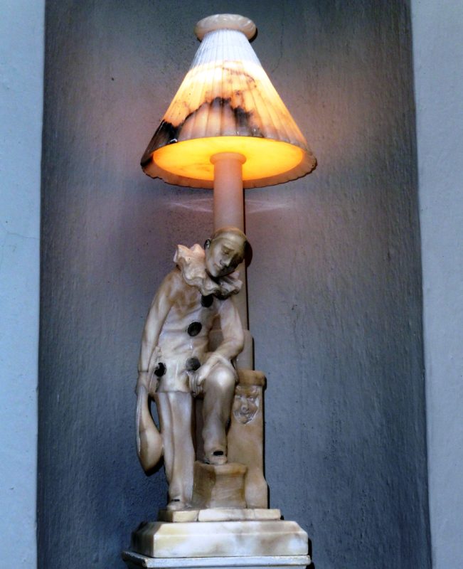 Con l’immagine che è qui eccoci alle prese con un semplice aspetto dell’arte che si contiene all’interno di quei villini, nel caso un Pierrot di marmo e una Colombina di tale natura, ambedue a modo di lumiera da porre in bella vista agli ospiti, posti nell’angolo più affascinante e delizioso della casa. Queste due immagini ci danno lo spago per tessere un pensiero legato a un fondamentale passo di chi allora intraprese le vie del mondo, quel giovane di allora che si trovò sua volta a interpretare Pierrot o Pierò, altra la Colombina sbarazzina.