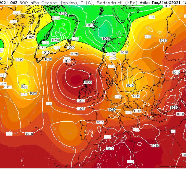 Se prendiamo le carte di previsione di questa mattina vediamo come la disposizione delle varie figure bariche ci conferma che l’estate è praticamente alla fine sulle nostre zone. Ritroviamo una zona di alta pressione, decisamente ben organizzata, in prossimità dell’Inghilterra, ma contemporaneamente, sul suo fianco orientale, gocce fredde ed aria più fresca in quota determinano episodi di maltempo.