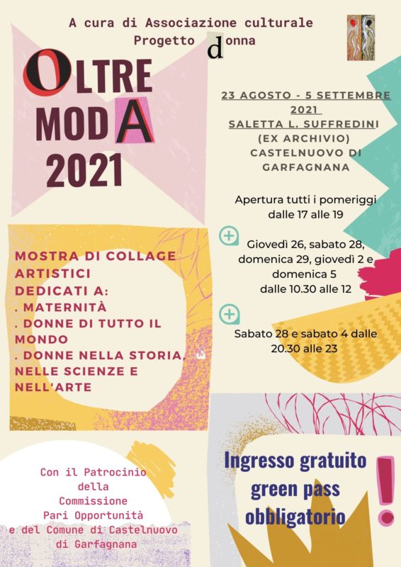 CASTELNUOVO – Apre oggi – lunedì 23 agosto alle 17 – la mostra di collage artistici “Oltremoda 2021” a cura dell’Associazione Culturale Progetto Donna di Castelnuovo di Garfagnana.