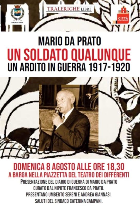 BARGA – Il barghigiano Mario Da Prato, durante la Prima guerra mondiale, fu un Ardito. Il nipote Francesco ha ritrovato il diario di guerra che verrà presentato domenica 8 agosto alle 18.30 a Barga davanti al teatro dei Differenti. Presentano il libro, dal titolo “Un soldato qualunque. Un ardito in gfuerra 1917 – 1920”, Umberto Sereni e Andrea Giannasi. Saluti della sindaca Caterina Campani