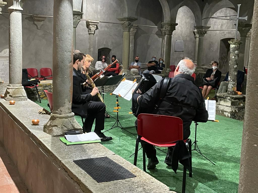 VILLA COLLEMANDINA – Un’ora e mezzo di virtuosismi e originalità sul palco. Dalla musica ebraica al klezmer, dalle colonne sonore di Ennio Morricone alle composizioni che hanno reso celebre Astor Piazzolla. Ieri sera, giovedì 5 agosto, nei pressi del suggestivo chiostro romanico della chiesa di San Sisto e Santa Margherita di Villa Collemandina si è svolto il concerto del Trio Italiano, formazione musicale composta da Endrio Luti (fisarmonica), Thomas Luti (sax) e Cristina Trimarco (fagotto).