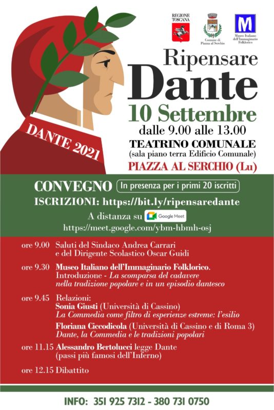 PIAZZA AL SERCHIO – Si terrà il 10 settembre, a partire dalle ore 9, Le ragioni di ripensare Dante – In ricordo di Mario Seita – Convegno per una prospettiva inconsueta su Dante, organizzato dal Comune di Piazza al Serchio, grazie al contributo della Regione Toscana, in collaborazione con il Museo Italiano dell’Immaginario Folklorico.
